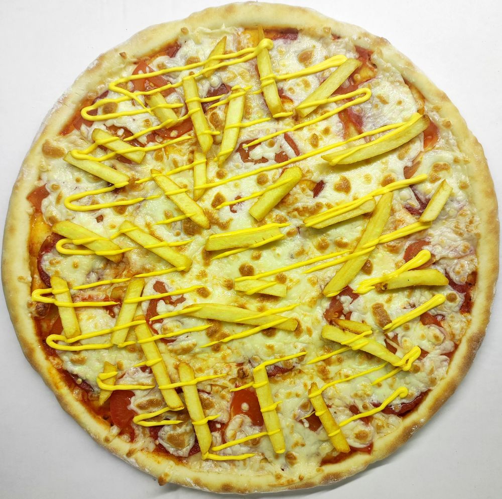 Соус томатный, Сервелат, Помидор, Соус сырный, Картофель фри, Сыр