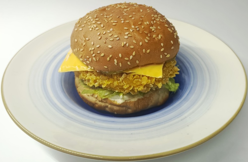 Котлета куриная в хрустящей панировке,пекинская капуста,маринованный огурец ,тостерный сыр соус фирменый