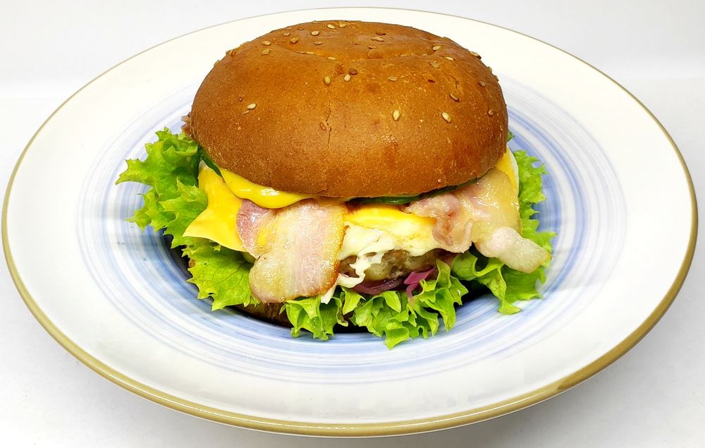 Свиная котлета, Соус горчичный, Бекон, Сыр моцарелла, Сыр тостерный, Лук, Лист салата